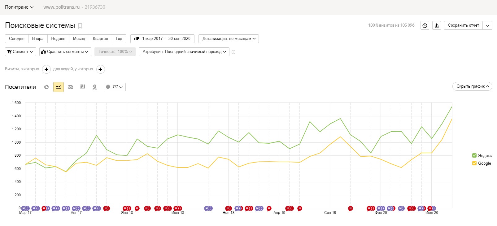 Важно учесть, что поддомены сайта были закрыты от индекса в Google, поэтому позиции в поисковой системе Google +- равны из-за того, что в поиске участвует только главное зеркало сайта — www.politrans.ru.